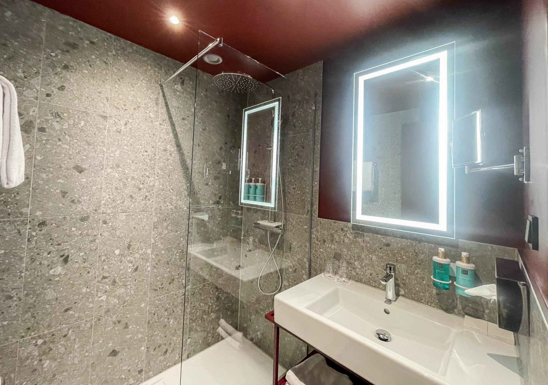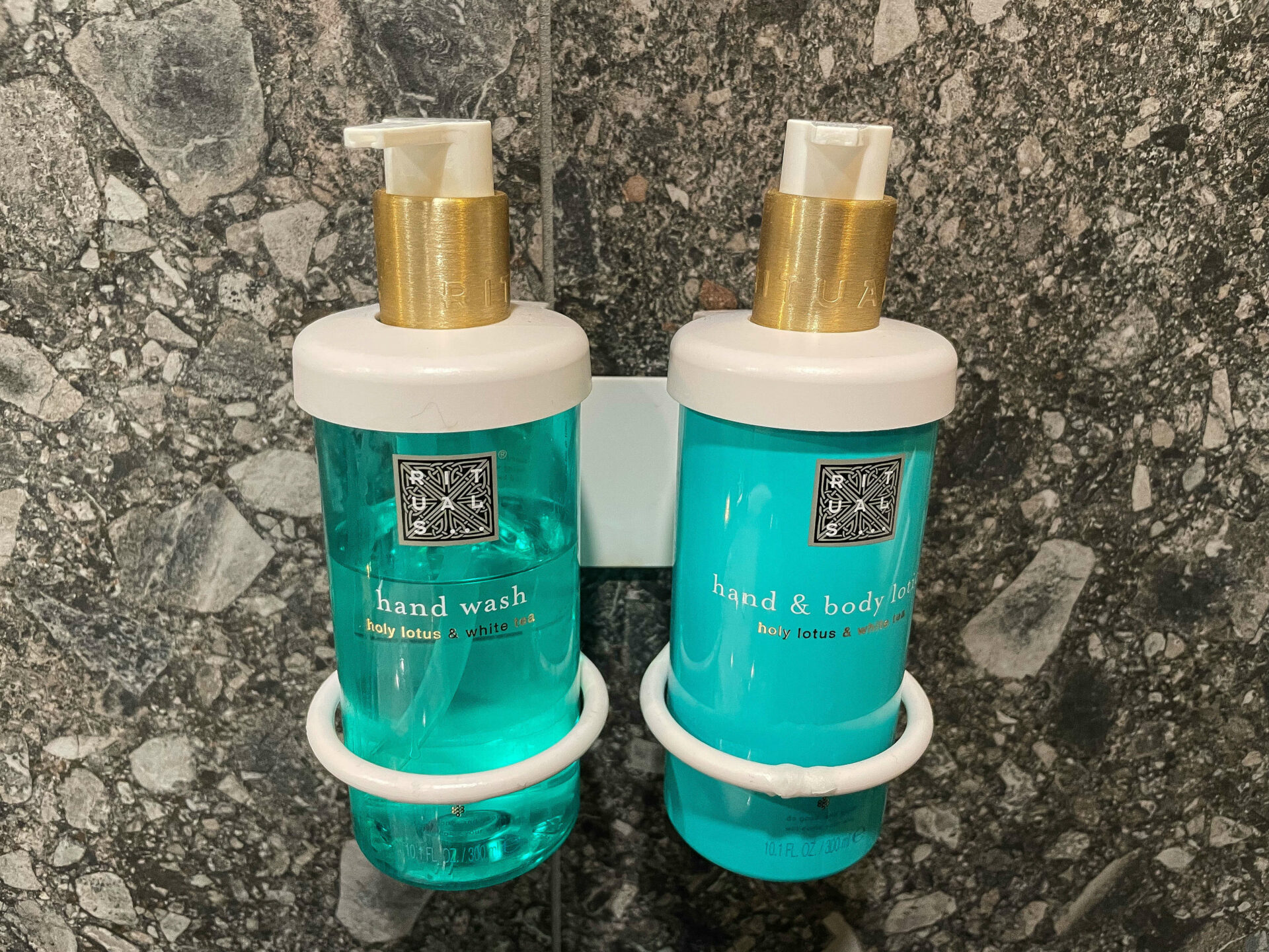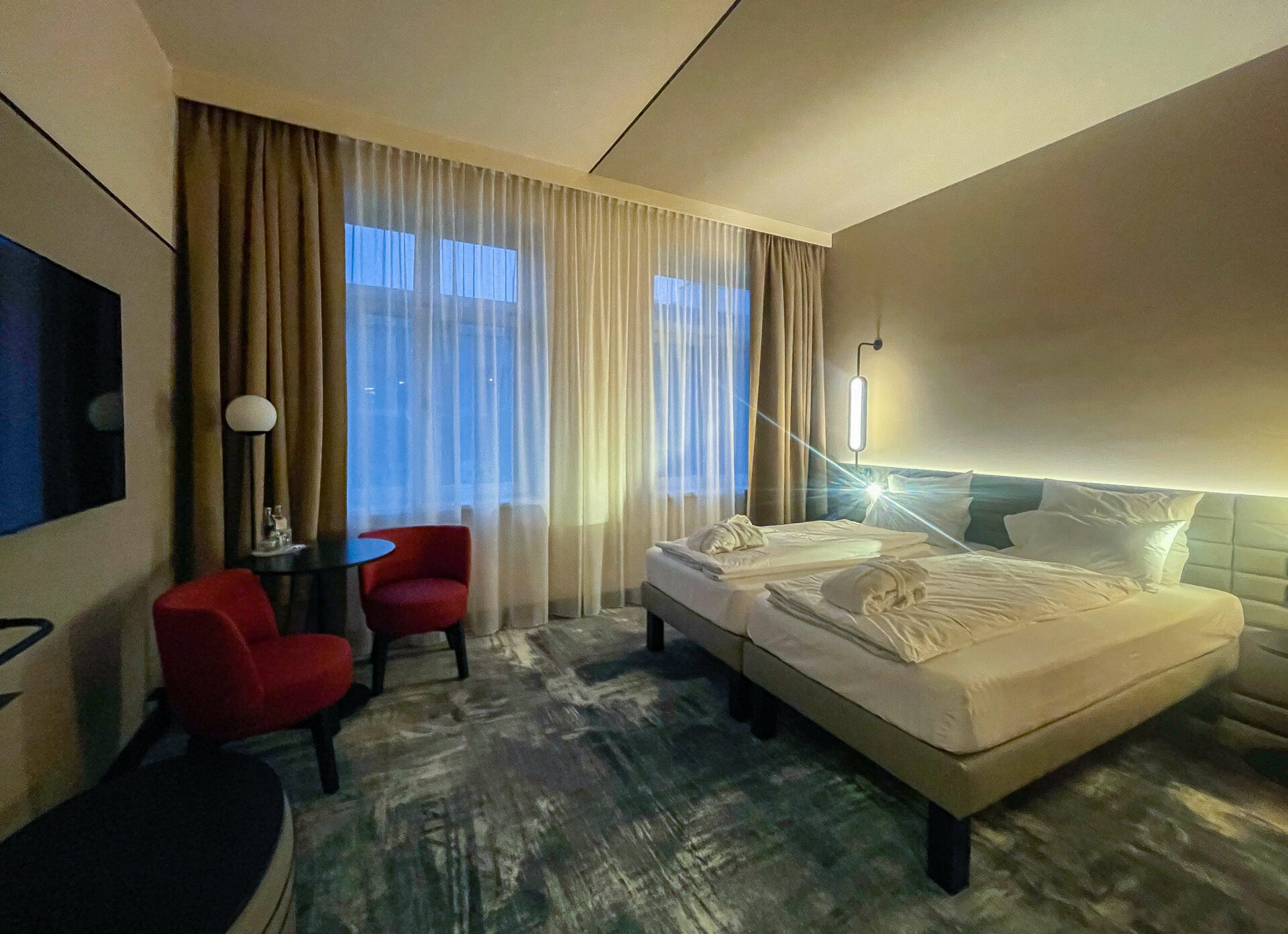 Die Zimmer sind im Schnitt 25 Quadratmeter groß und setzen auf ein harmonisches, elegantes Farbkonzept – schiefergrau und weinrot dominieren. Auf unnötige Möbel wie sperrige Kästen oder Schreibtische wird verzichtet, stattdessen gibt es Aufhängemöglichkeiten an der Wand und gemütliche Sitzgelegenheiten. Im Badezimmer wird auf Nachhaltigkeit geachtet und die kleinen Tiegel mit Duschgel durch größere Spender ersetzt. Der Inhalt kommt aber nach wie vor von der Kosmetikmarke Rituals. Dazu kommt eine Kapselkaffeemaschine. Es gibt drei Zimmerkategorien und zwei Suiten für Familien.