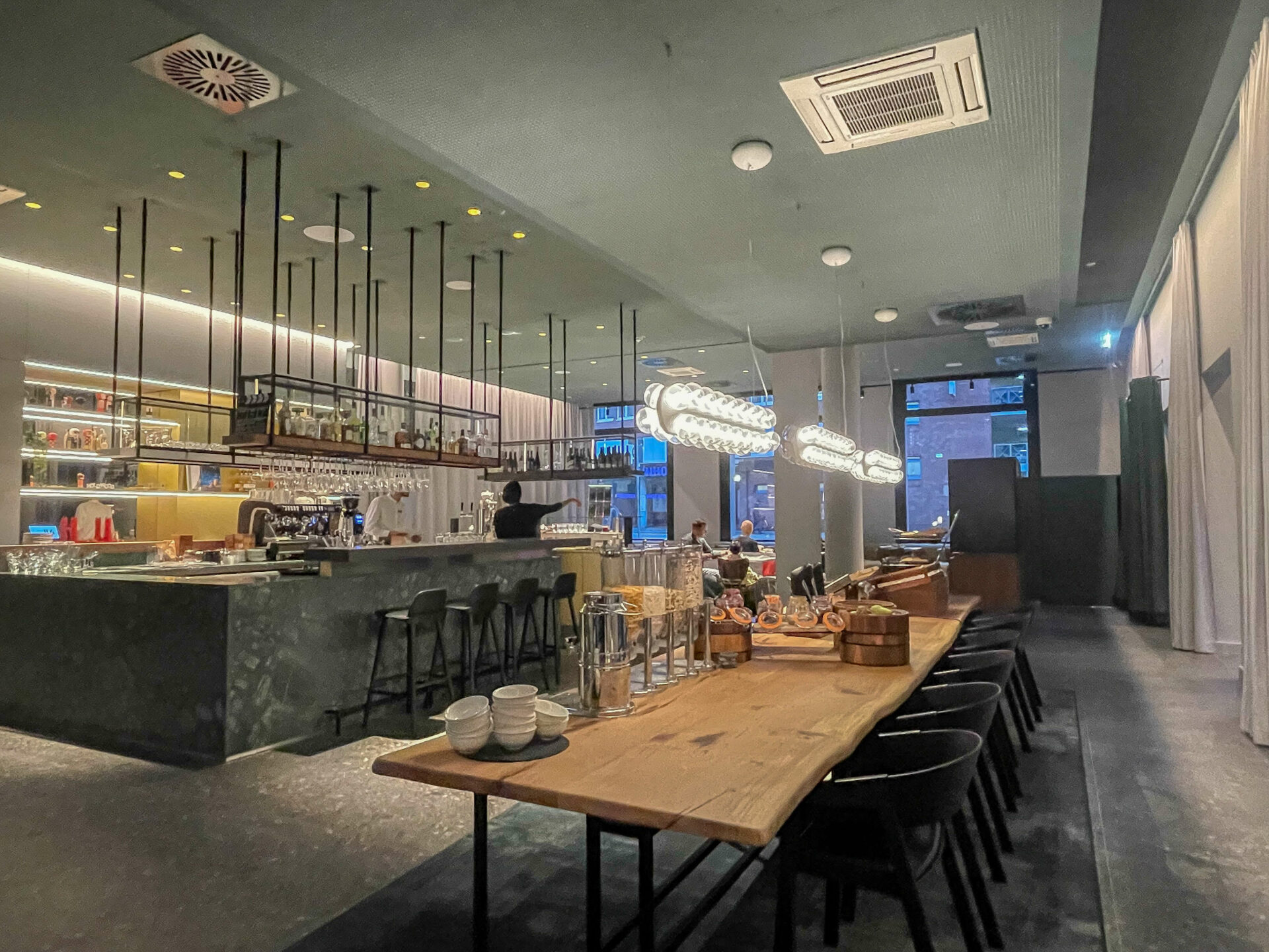 Das Frühstück ist umfangreich und frisch. Das Herzstück des Hauses ist unter anderem die Bar mit Barkeeper. Im Restaurant Gold & Brown wird kalifornische Küche serviert – ein Mix aus asiatischen, südamerikanischen und amerikanischen Gerichten. Leichter Fisch, Steak und Burger. Wer mit Freunden kommt, sitzt am großen Tisch und isst im „family-style“. Das heißt, die Gerichte werden in die Tischmitte gestellt und jeder kann von allem kosten. Praktisch: Auch mittags und nachmittags gibt es etwas zu essen. Darunter finden sich auch regionale Spezialitäten, wie die Käseplatte der naheliegenden Hafenkäserei.