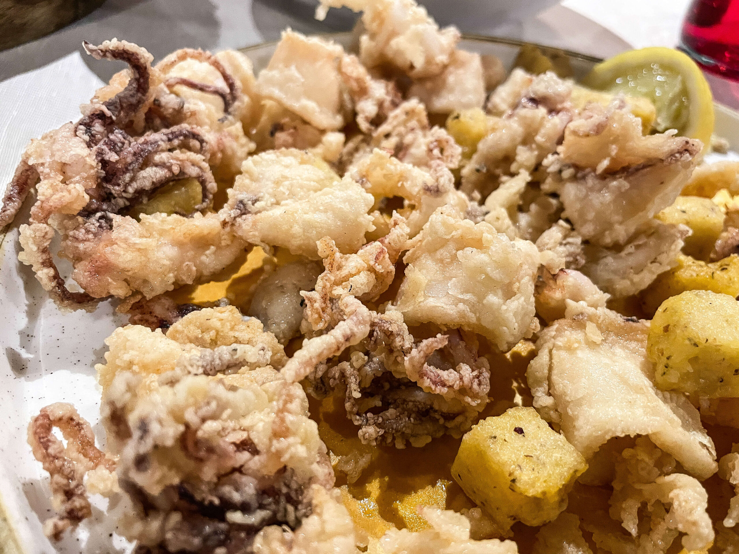 Selbstredend, dass es in den Restaurants überwiegend Fisch auf den Tisch kommt. Und dass wir gleich schon mittags einkehren, um Scampi, Calamari und Branzino zu verspeisen. Weil es regnet, können wir nicht draußen auf der Piazza sitzen, aber dafür lodert drinnen das offene Feuer. Und auch diesmal darf das Tiramisu nicht fehlen. Ich war schon öfters in Marano Lagunare und habe in verschiedenen Restaurants gegessen – es war immer ausgezeichnet und frisch. Einfach ausprobieren!