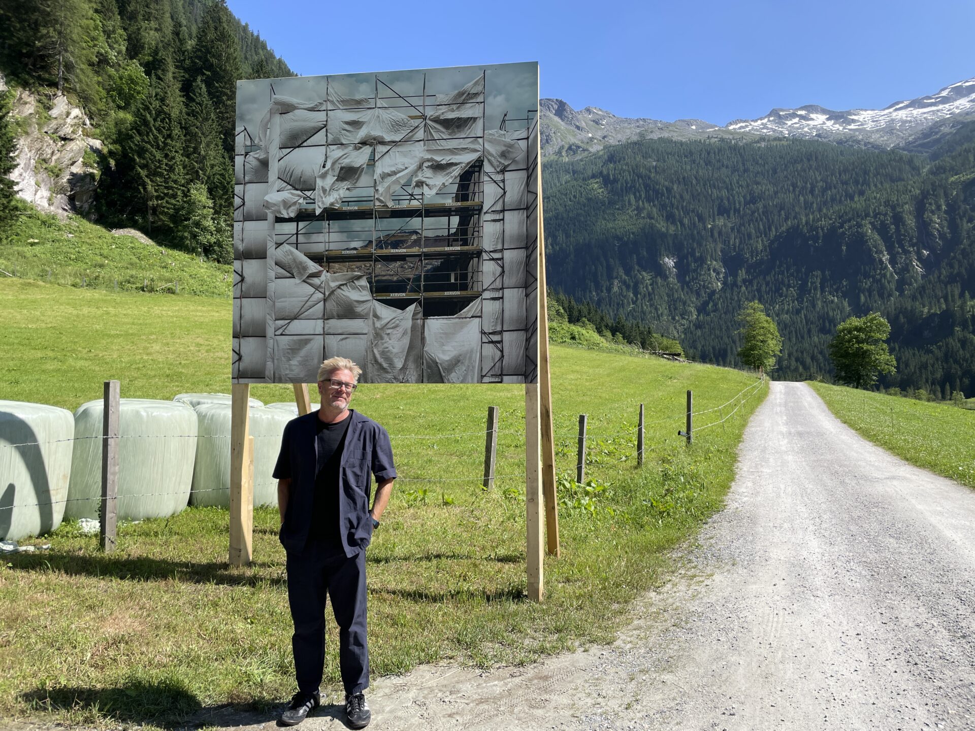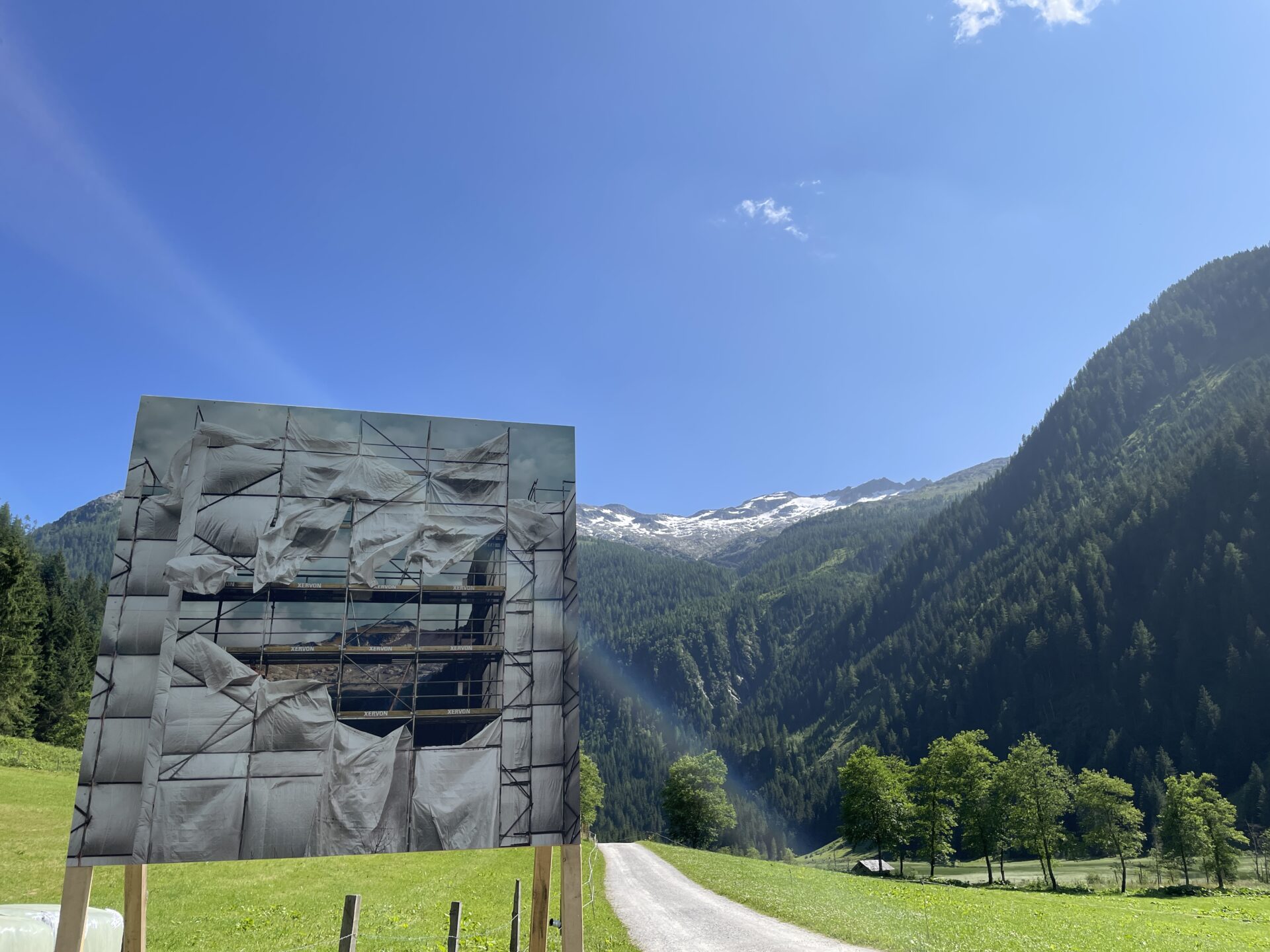 Der Talschluss Hüttschlag bildet das Ende des Tales und liegt bereits im Nationalpark Hohe Tauern. Besucher*innen können kostenlos am Parkplatz beim Talwirt (sehr gutes Nationalpark-Eis!) stehen bleiben und dem Gehweg hinein zum Ötzlsee folgen. Gleich zu Beginn bietet sich ein kurzer Abstecher zum Wasserfall. Danach geht es fast eben weiter bis zum ersten Kunstwerk mit direktem Blick auf den Gletscher Keeskogel. Jörg Auzinger greift das Thema Klimawandel auf und schuf mit seiner Fotomontage ein Doppelbild der Landschaft. Eine komplexe Geschichte, die mit der Funktion von Bildern spielt.