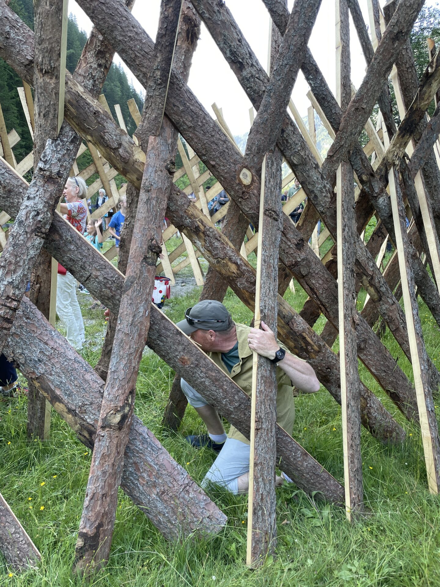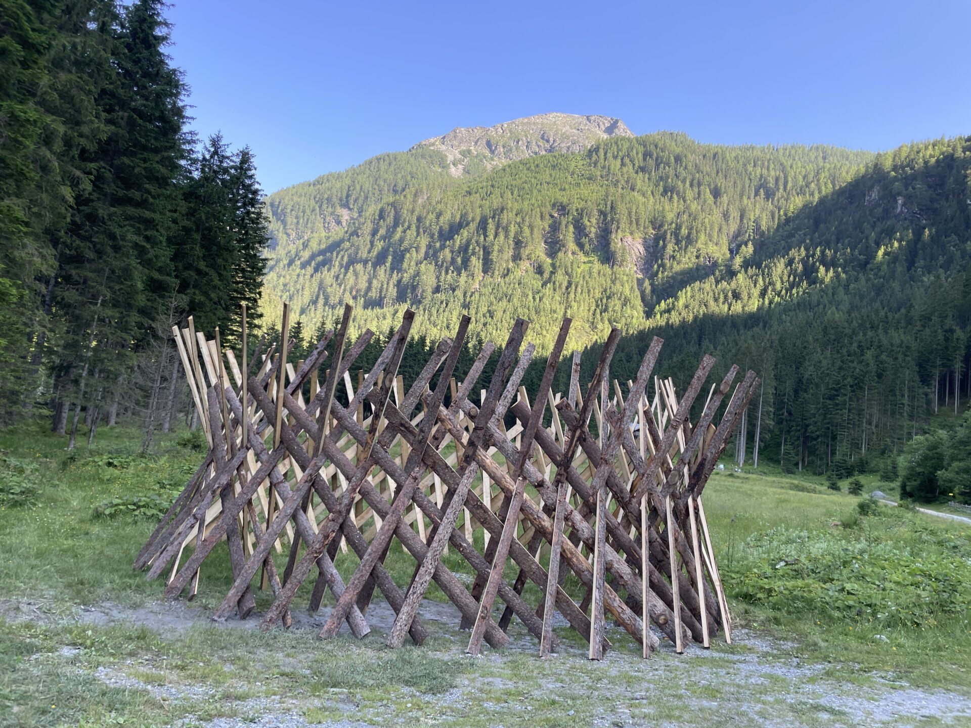 Mit Blick auf den Gletscher und die Aulandschaft geht es vorbei an Wildblumen und schattigen Bäumen zu den Heustadel-Variationen von Clemens Bauder. Ihm sind im Tal die vielen alten Heustadel aufgefallen, die heute keine Funktion mehr haben. Das ließ ihn nicht mehr los und er überlegte sich, wie den Heustadeln eine neue Aufgabe gegeben werden kann. Entstanden sind daraus zwei neue Rauminstallationen, die den gleichen Grundriss haben wie die Heustadel im Tal. Die Schüler*innen der HTL Kuchl haben beim Aufbau geholfen und mehr als 6.000 Schrauben verarbeitet.