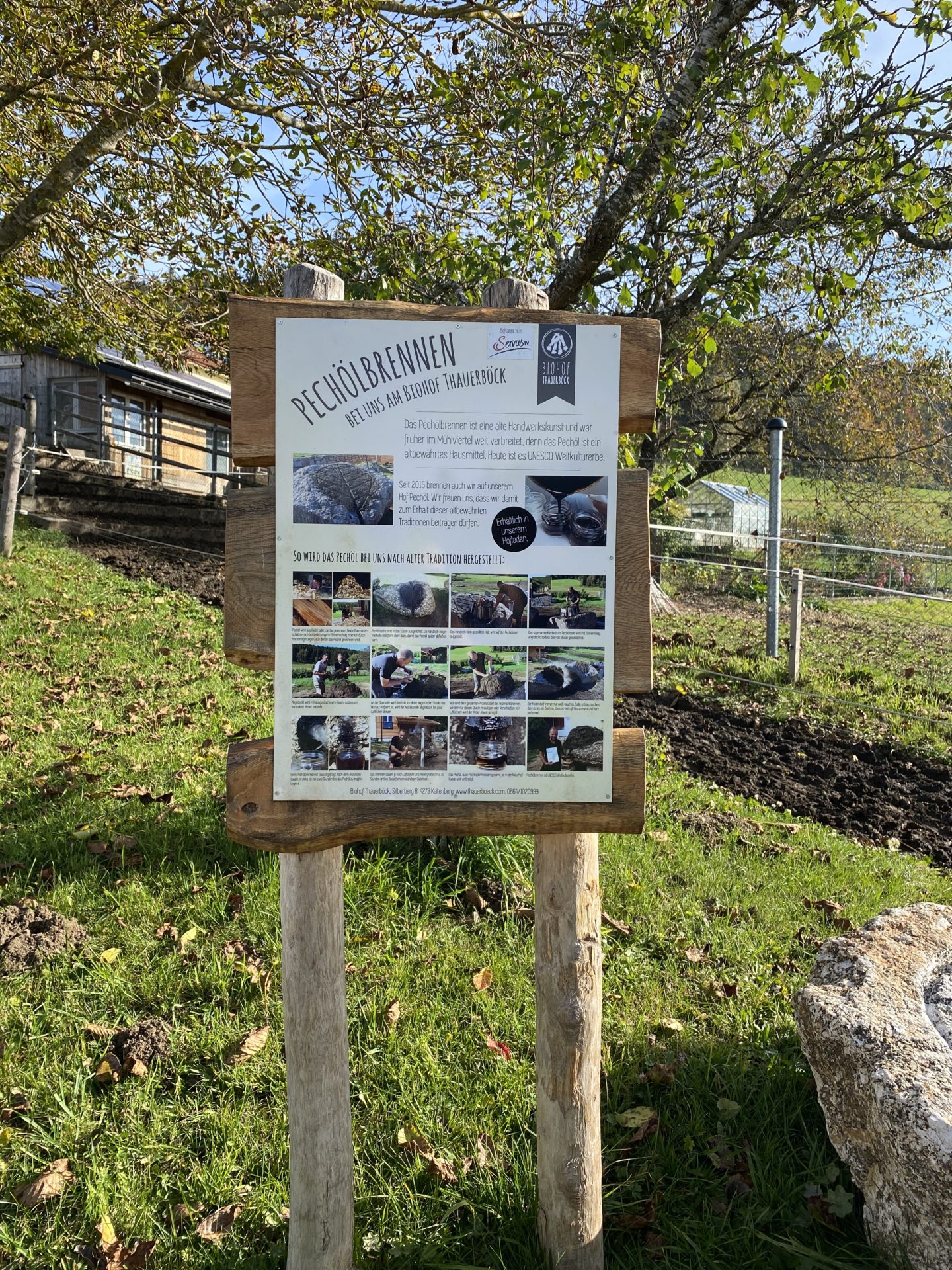 Am Hof wird auch noch Pechöl gebrannt. Das ist eine alte Handwerkskunst, welche früher im Mühlviertel weit verbreitet war. Das Pechöl ist ein altbewährtes Hausmittel – für die Versorgung von Wunden und das Schmieren von Wagenrädern. Herzreiche Auswüchse von Föhren werden hierfür pyramidenförmig auf einem Pechstein mit einem eigenen Rillensystem aufgeschlichtet, mit Fichtenästen, Rastenstücken und Erde abgedichtet. Dann wird er entzündet und brennt 24 Stunden oder länger. Das Holz verglost langsam und durch die Hitze entsteht das Pechöl, welches durch die Rillen abrinnt und in einem Gefäß aufgefangen wird.