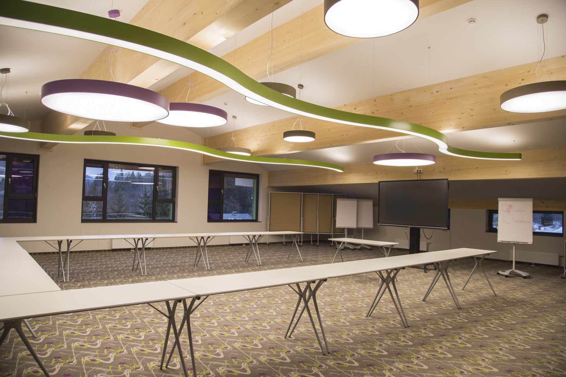 Moderne Möbel und Panoramafenster mit direktem Blick auf die Piste, dazu eine Video-Wall mit den wichtigsten Informationen und Tipps. Fotos können über die App gleich mit der Community geteilt werden, die Gastronomie im Ort geteilt und empfohlen werden.