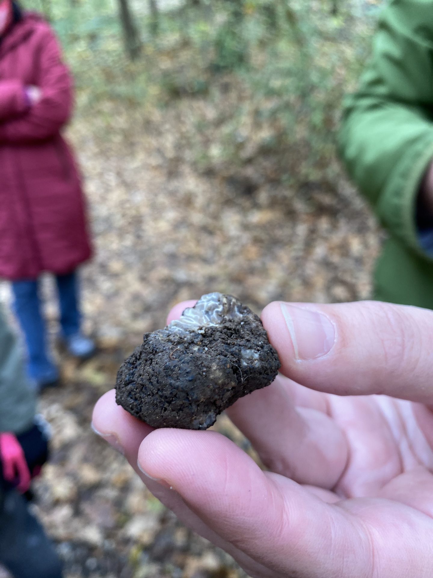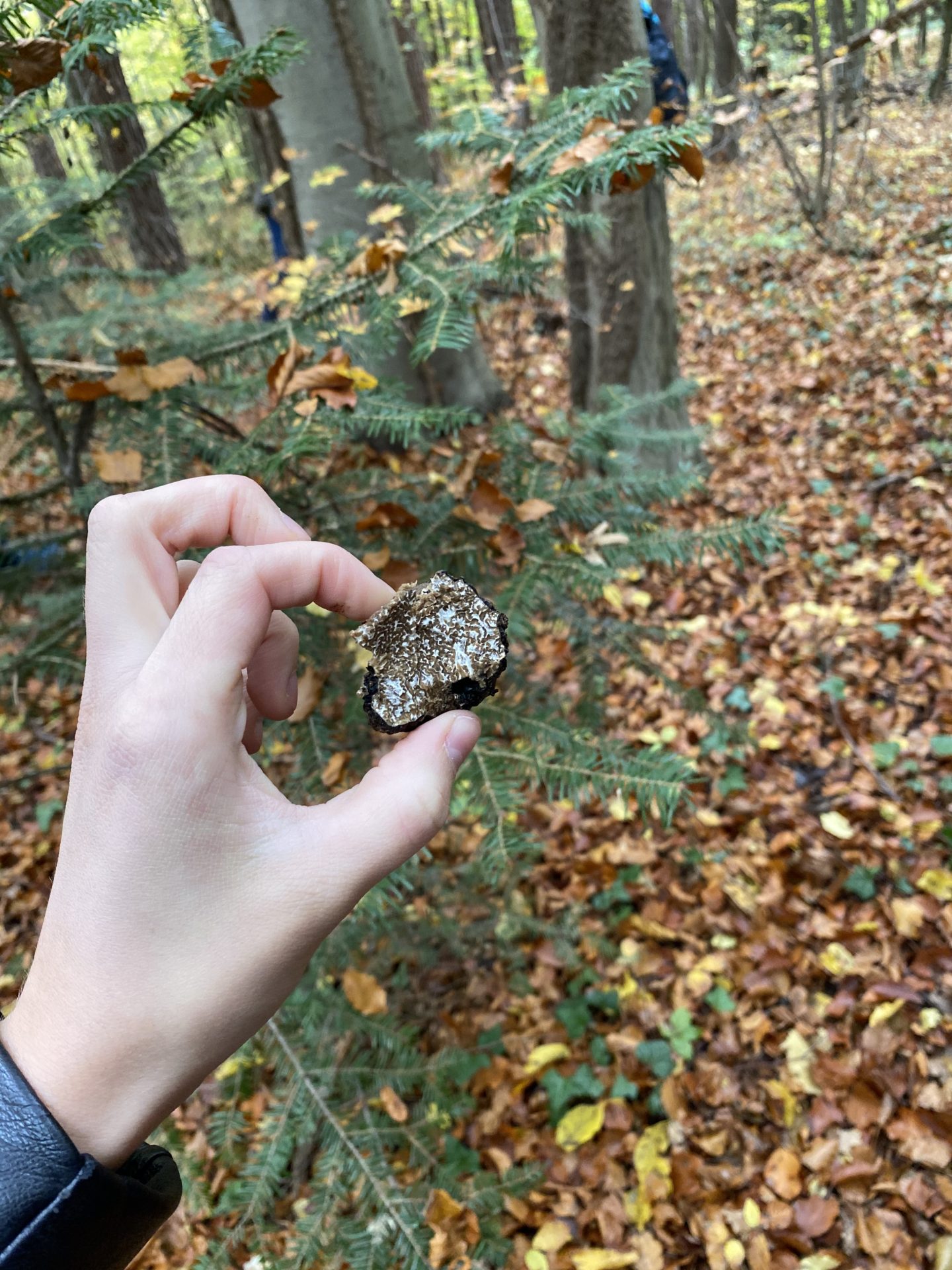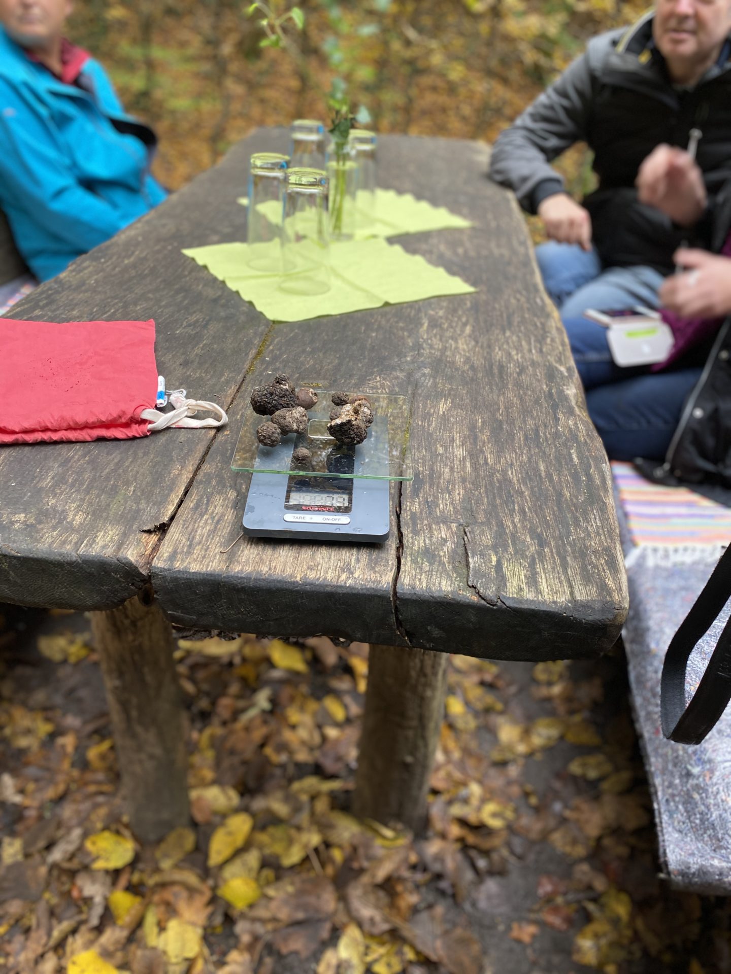Der sechs Monate alte Trüffelhund Pablo ist relativ neu an Board, beweist aber bereits große Motivation und Willen am Suchen. Heute darf der Kleine zwar noch nicht mit dabei sein, aber dafür kommt die erfahrene Trüffelhündin Camouflage zum Einsatz. Gemeinsam mit den Interessierten streift sie durch die Wälder und wird fündig.