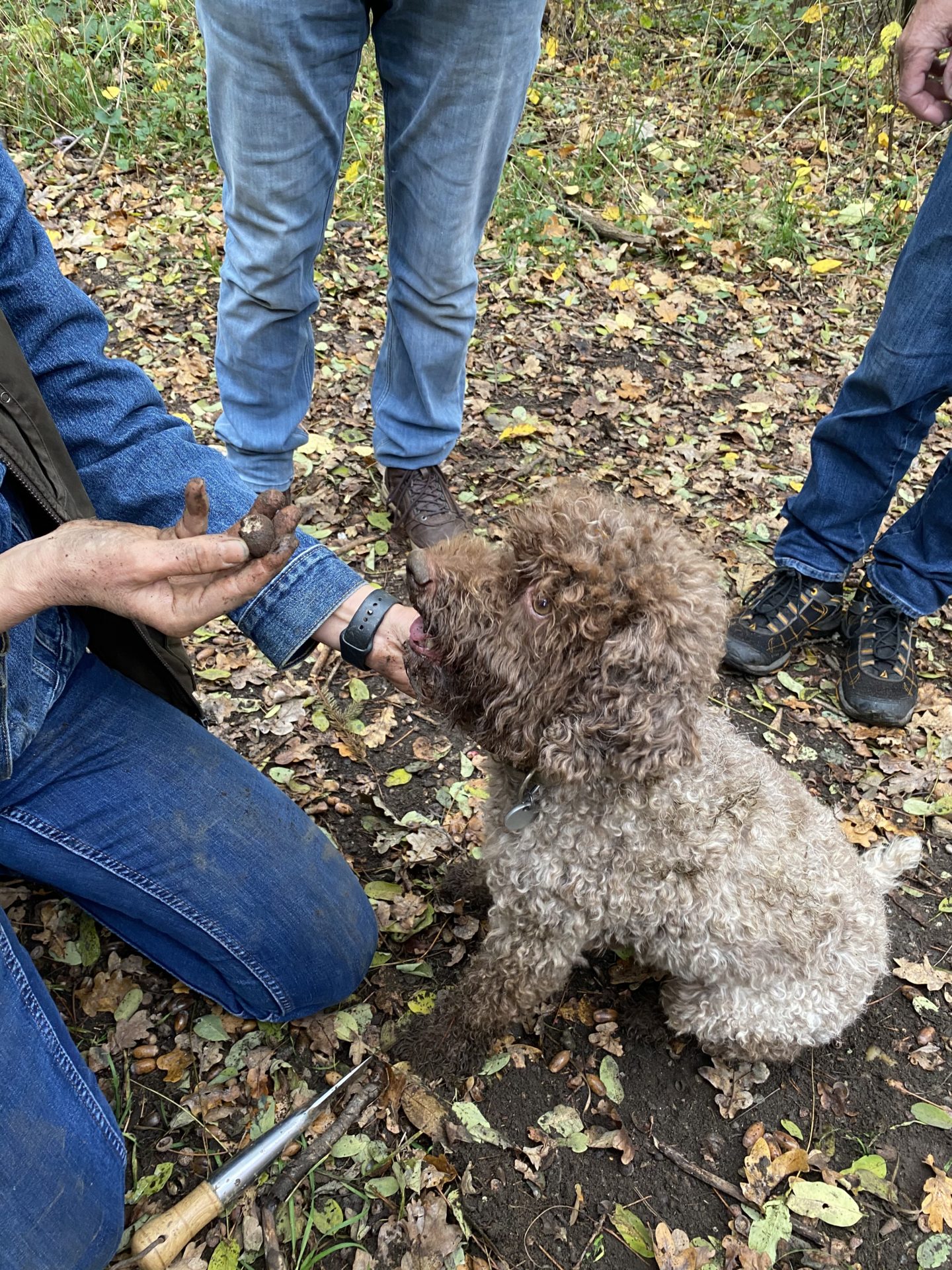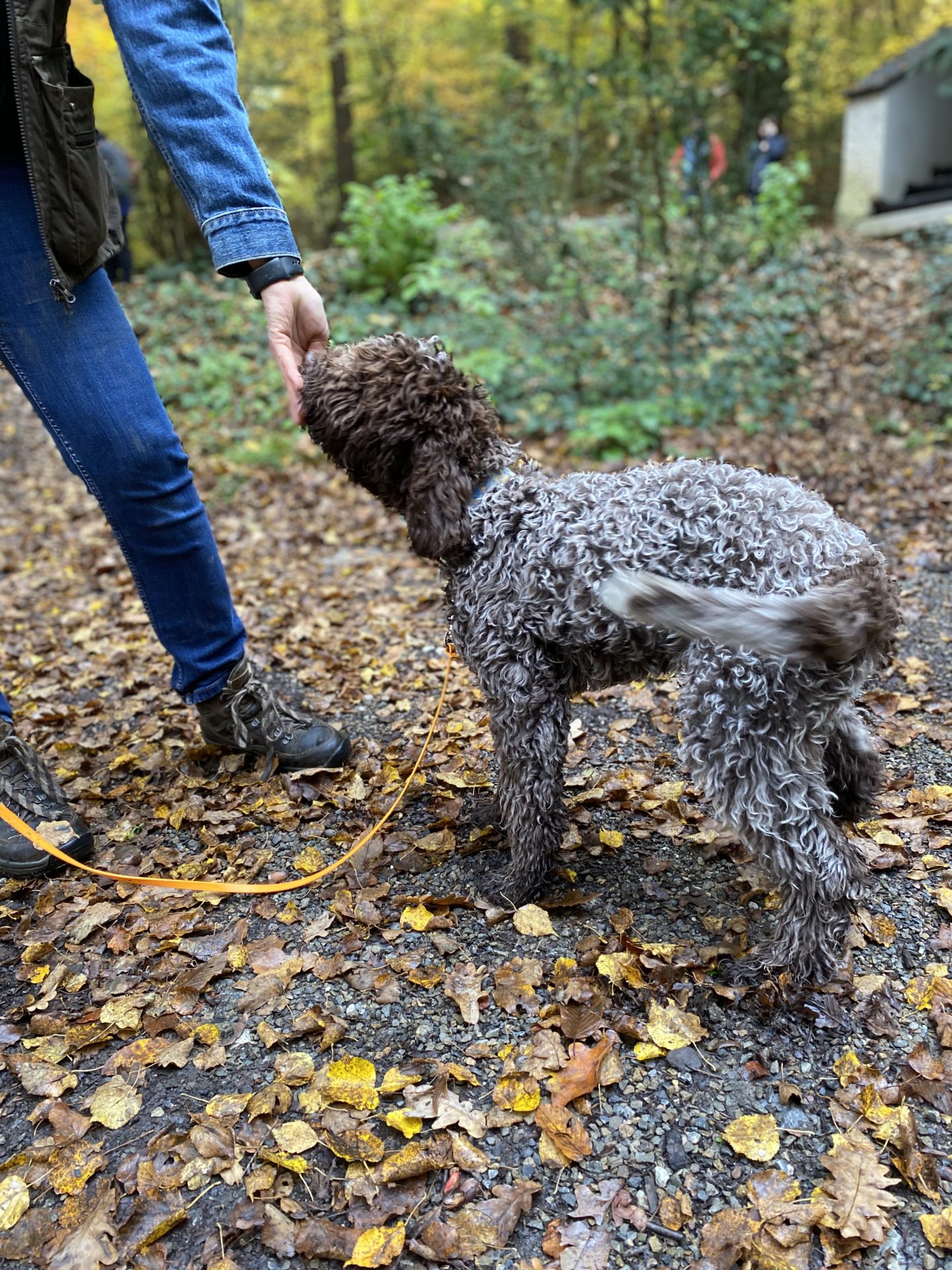 Aus diesem Grund befinden wir uns heute vor Ort, im Leechwald, bereit für unsere erste Trüffelwanderung. Ausgebildete Hunde der Rasse Lagotto Romagnolo, also italienische Trüffelhunde, suchen hier täglich mit großer Begeisterung und viel Leidenschaft nach den beliebten Luxus-Knollen. Diese Hunderasse wurde eigentlich zur Wasserjagd eingesetzt, bis es zur Trockenlegung der Lagunen in Italien kam. Zwischen 1830 und 1870 wurde die Rasse schließlich zum Trüffelhund umgeschult. Mit Erfolg.