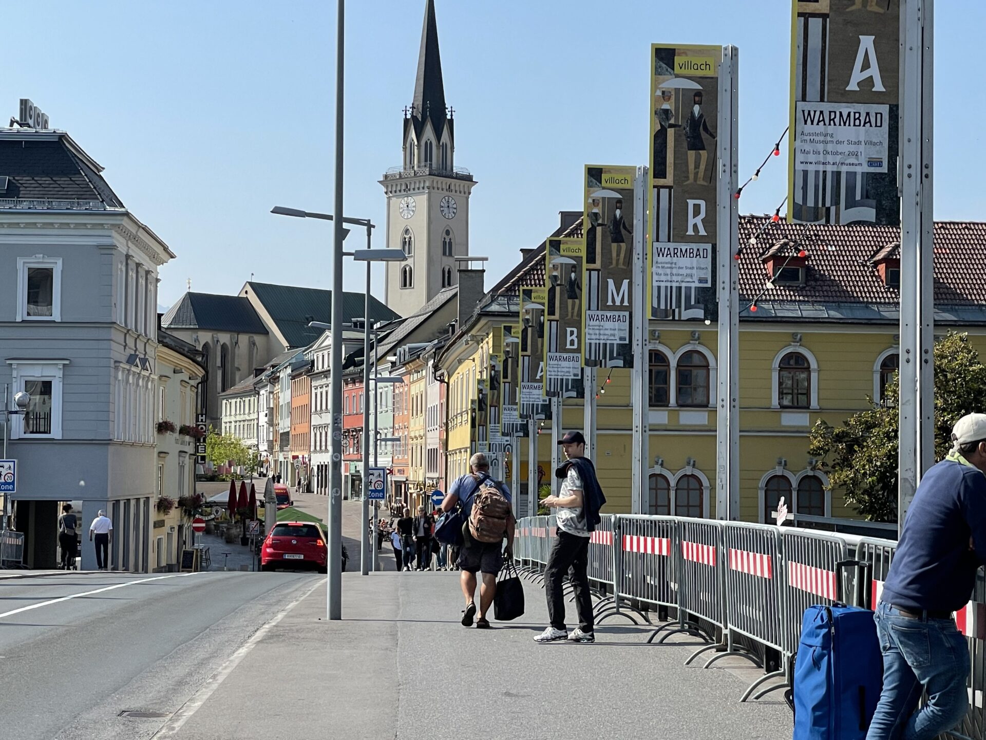 Als landschaftlicher Wegweiser dient die rote Friedensbrücke über die Drau. Irgendwie markiert sie den Eintritt in ein innovatives Viertel von Villach, das etwas außerhalb vom Zentrum mitten im Grünen liegt. Ich kann mir gut vorstellen, dass es in so einer Umgebung leicht fällt, an neuen Ideen zu arbeiten. Wir folgen dem Radweg entlang der Drau bis zur nächsten markanten Brücke. Dabei sehen wir Ecken der Stadt, die wir vorher nie so richtig wahrgenommen haben.