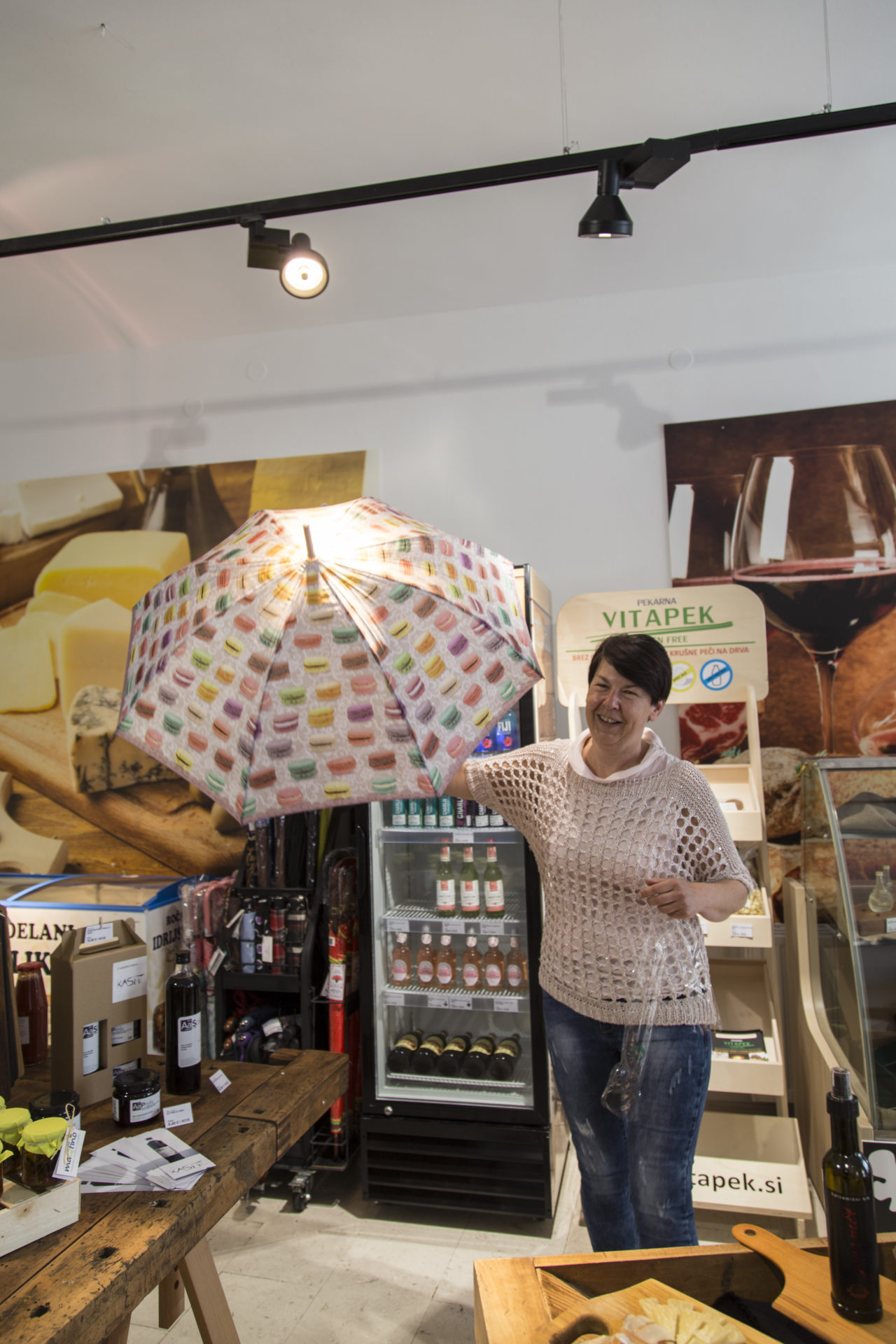 Ein Stück weiter am Hauptplatz hat Katharina den Delikatessenladen namens Figa reichlich bestückt. Sie verführt mit Potica, Schafkäse, Balsamico, Spezialitäten von der Küste, handgemachten Regenschirmen und Weinen aus Slowenien.