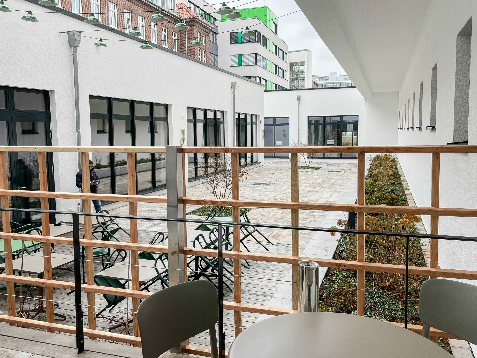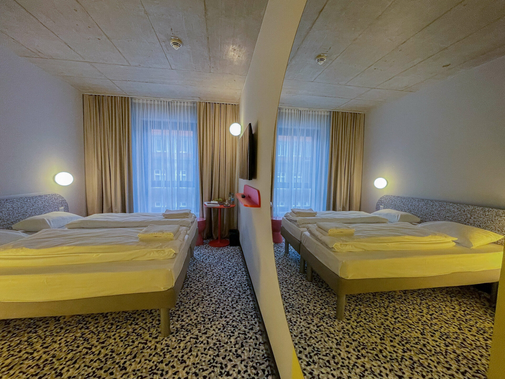 Die Zimmer haben im Schnitt rund 18 Quadratmeter und bieten alles, was gebraucht wird: Dusche, bequemes Bett, Fernseher, ein paar Tischchen als Ablagefläche. Auf sperrige Kästen wurde verzichtet. Stattdessen gibt es offene Möglichkeiten, um das Gewand aufzuhängen. Der Großteil der Zimmer zeigt in den Innenhof, entsprechend ruhig ist es in der Nacht. Getränke und Snacks holt man sich in der Lobby. Zum Frühstück gibt es Gebäck, Gemüse, Wurst, Käse, Marmeladen, Müsli, Kaffee und Tee. Wer möchte kann im Sommer sogar draußen auf der Terrasse im Innenhof sitzen.