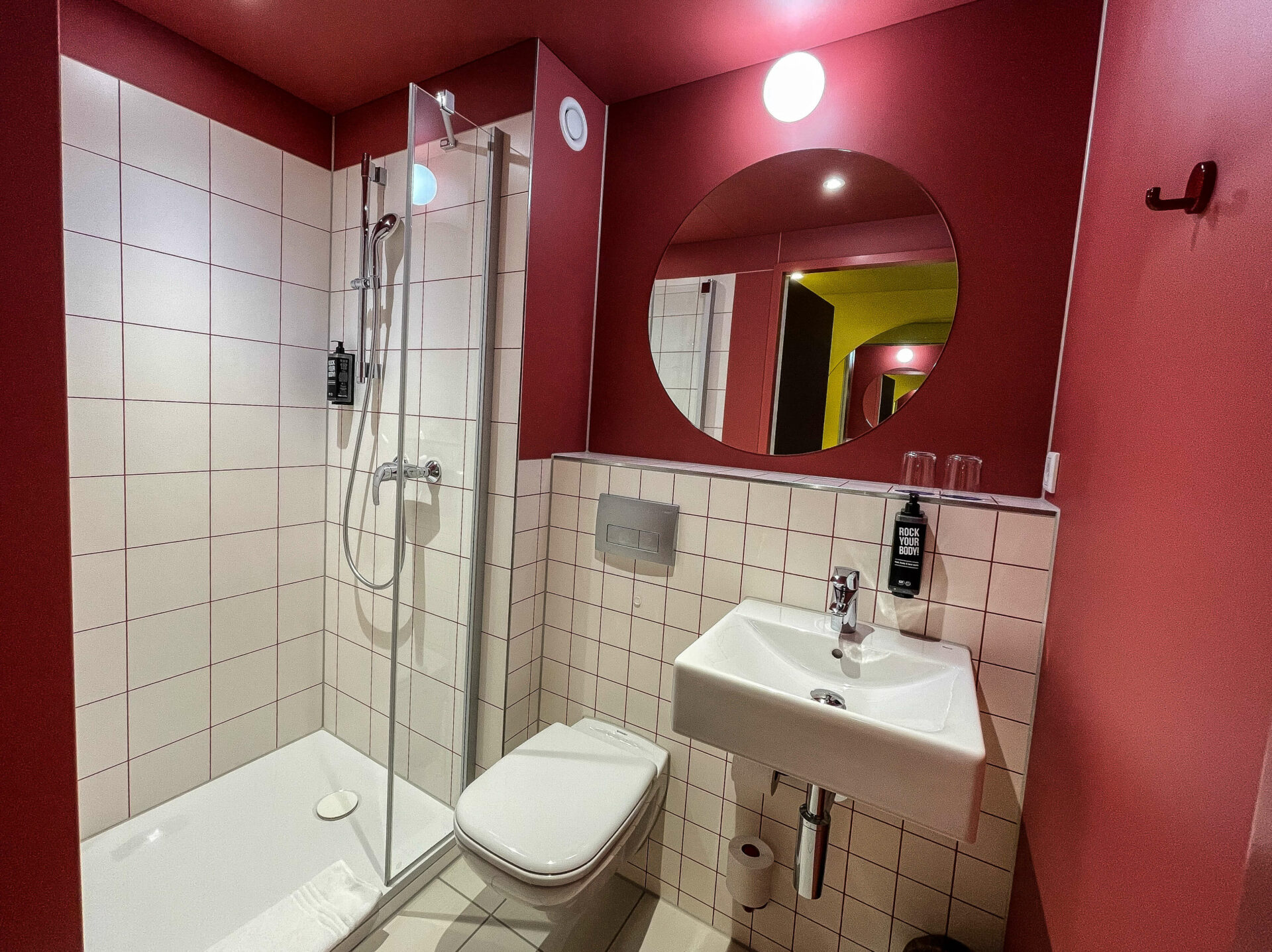 Beim Citytrip nach Münster nicht viel Zeit im Hotel eingeplant? Dann darf es auch ruhig einmal eine Brieftaschen schonende Alternative sein. Erst im September 2022 neu eröffnet hat das ibis budget Münster City mit 123 Zimmern. Vom Hauptbahnhof in Münster muss der Koffer nur kurz bis zum Eingang geschleppt werden. So wird man sein Gepäck schnell los und kann zu Fuß oder dem Rad zur Stadterkundung aufbrechen. In rund zehn Minuten ist man zum Beispiel per pedes beim Picasso-Kunstmuseum, das mit dem Mut zur Farbe gut zum Hotelkonzept passt. Denn auch hier wurde bei der Einrichtung kräftig in den Farbtopf gegriffen. Kann gut sein, dass es manchen ein wenig zu viel Farbe und Muster am Teppich ist. Ich finde den Mut zum modernen Farben- und Formenspiel recht erfrischend. Einmal etwas anderes und für ein Budgethotel recht stylish. Eyecatcher ist der große runde Spiegel im Zimmer.