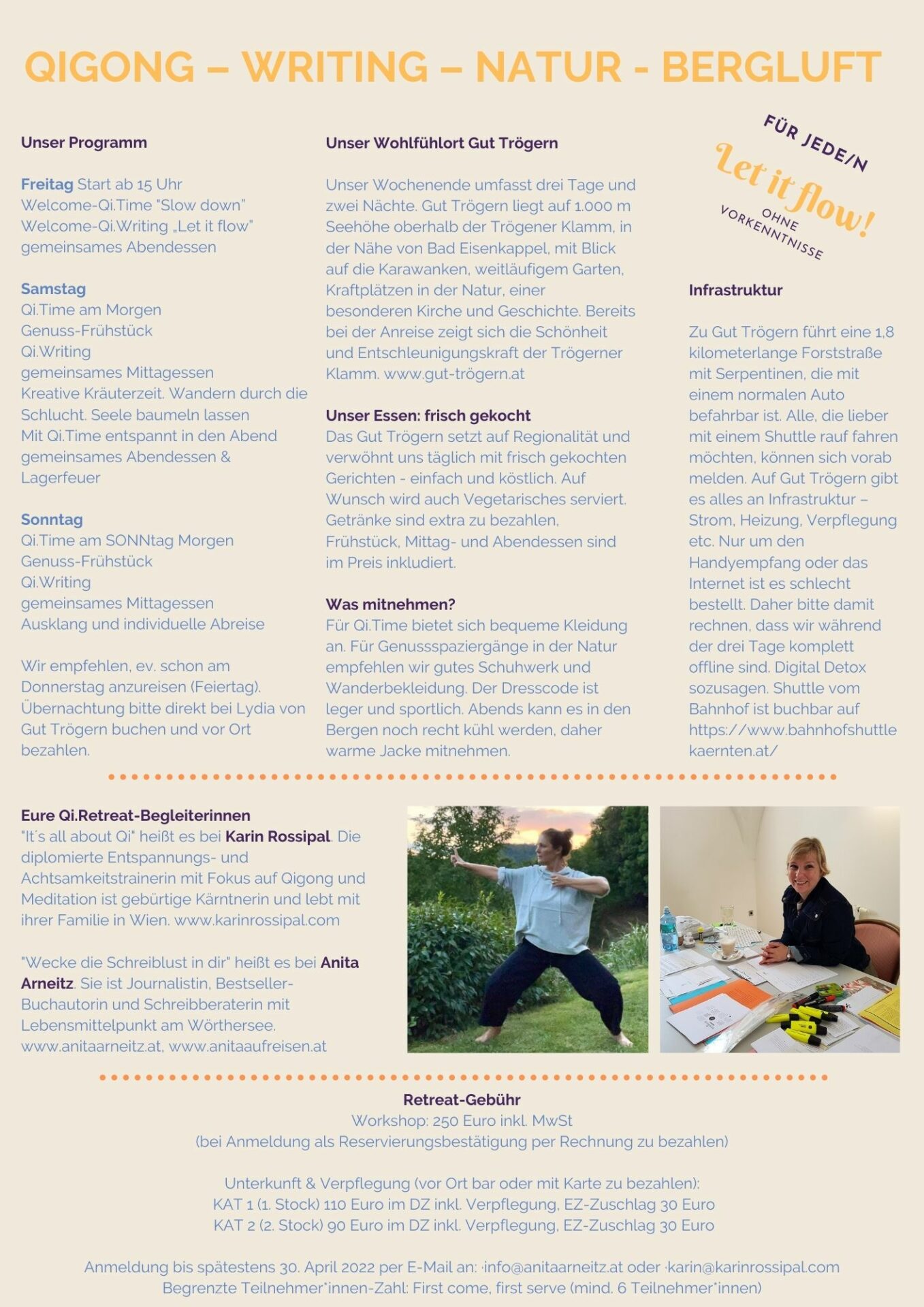 Ablauf: Ankommen am Freitag bis 12 Uhr, Welcome-Drink, Freitag Nachmittag erste gemeinsame Schreibeinheiten, Abendessen, Austausch in der Gruppe. Samstag: gemütliches Frühstück/Brunch, kreative Schreibeinheiten am Vormittag und Nachmittag, wenn das Wetter zulässt auch draußen beim Elfenteich, bei der Zauberlinde oder in der rauschenden Klamm, Nachmittagssnack und Abendessen, Sterndal schauen beim Lagerfeuer, Sonntag Vormittag letzte Schreibeinheit, ab Sonntag Mittag gemütlicher Ausklang bei Kuchen und Kaffee, Abreise. Eine Nachlese findet ihr hier. Anmeldung direkt bei mir office@anitaarneitz.at oder info@gut-trögern.at.