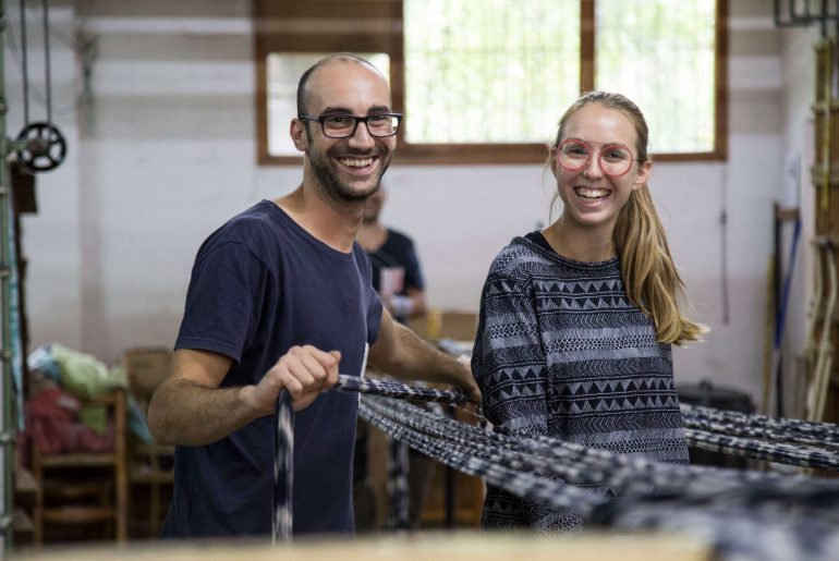 Jeder Stoff besteht aus Ketten- und Schussfäden. Die Kettfäden sind die vertikalen Webfäden. Mit diesen erzeugt die Familie die Musterung. Durch diese spezielle Technik gibt es keine Vorder- oder Rückseite wie bei anderen Stoffen. Die Stoffe sehen auf beiden Seiten gleich aus. Sind alle Fäden gefärbt und getrocknet, werden exakt 2052 Fäden auf den alten Webstuhl gespannt. Für die einfarbigen und gestreiften Stoffe wird das Spulengatter verwendet, während hingegen für die Zungentücher und Ikat-Muster fünf verschiedene Techniken zum Einsatz kommen. Die Kettfäden bestehen dabei aus Baumwolle, die Schussfäden aus Leinen. Das gibt dem Stoff eine besondere Dichte und etwas gröbere Struktur. Beim Weben werden die Fäden nicht aus den Augen gelassen. Schließlich soll kein Fehler oder Knoten entstehen. Das Endergebnis kann sich sehen lassen. Darauf ist Catarina stolz: „Unsere Stoffe sind einzigartig auf Mallorca.“