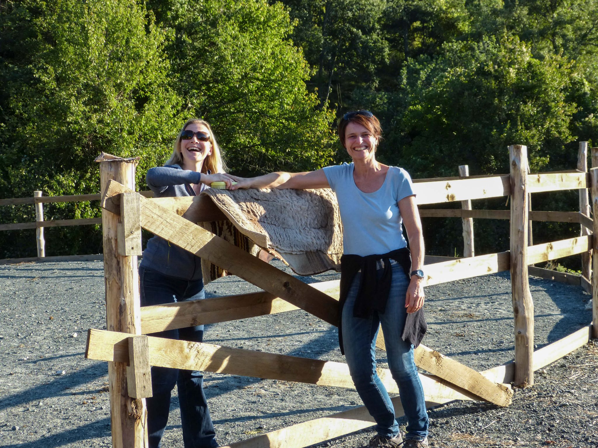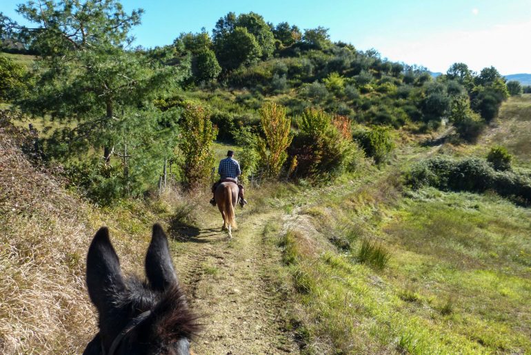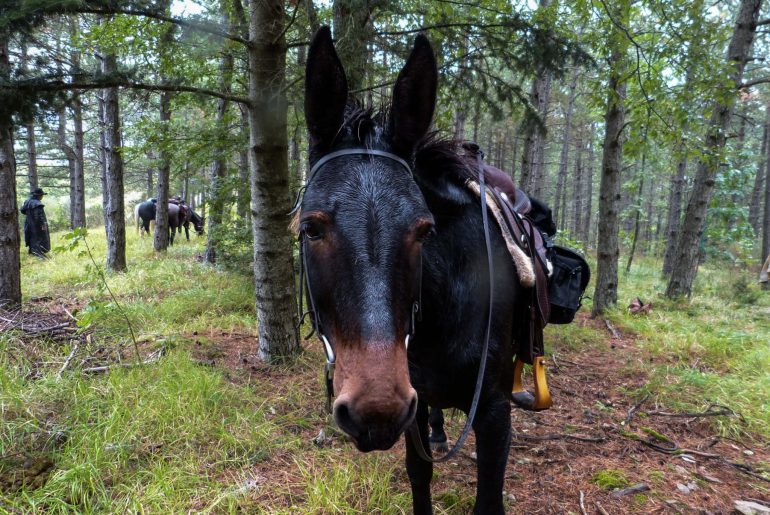 Bergauf und bergab geht es, mal auf steinigen, mal auf sandigen Wegen, durch herrliche Mischwälder mit unzähligen Kastanienbäumen, auf denen die Kastanien in ihren hellgrün-leuchtenden stacheligen Hüllen wie Trauben von den Ästen hängen. Meine Muli-Dame Mey stellt mich natürlich sofort auf die Probe: Grüne saftige Wiesen werden ohne Vorwarnung angesteuert, ein „Ich will doch lieber wieder umdrehen“-Versuch, kräftiges Kopfschütteln beim Bergabgehen – das volle „Esel-Programm“. Doch ich lasse mich nicht entmutigen. Ich arbeite mit ihr und vor allem an mir: um ihr zu zeigen, wer hier das Sagen hat, aber auch – und ich habe das Gefühl, das ist bei Mulis fast noch wichtiger – um ihr zu zeigen: ich passe auf dich auf, ich bin da, vertraue mir. So nehme ich sie beim Bergabgehen etwas kürzer am Zügel und beginne, mit ihr in ruhigem Ton zu reden. Einfach erstaunlich, wie sie mit ihren langen Ohren jeden Satz aufmerksam aufzunehmen scheint und siehe da – Mey wird immer ruhiger, aufmerksamer. Es dauert nicht lang, und ich habe mich schon wieder in meine Maultier-Lady verliebt.