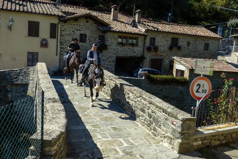 Nach 36 Kilometer erreichen wir „La Collina delle Stelle“, ein typisches toskanisches Landhaus, in Traumlage auf einem 3 Hektar großen Grundstück – richtig luxuriös haben wir’s hier – die Pferde und die Reiter. Hier befinden wir uns übrigens im sogenannten „grünsten Teil der Toskana“, in der Region Casentino (Gebirgstal der Provinz Arezzo), wo unendlich scheinende Wälder (übrigens der größte Nationalpark Italiens), romanische Kirchen, alte Klöster und mittelalterliche Dörfer die Landschaft prägen. Ein eher unbekanntes Tal in der Toskana, das gerade deshalb als Geheimtipp gilt.