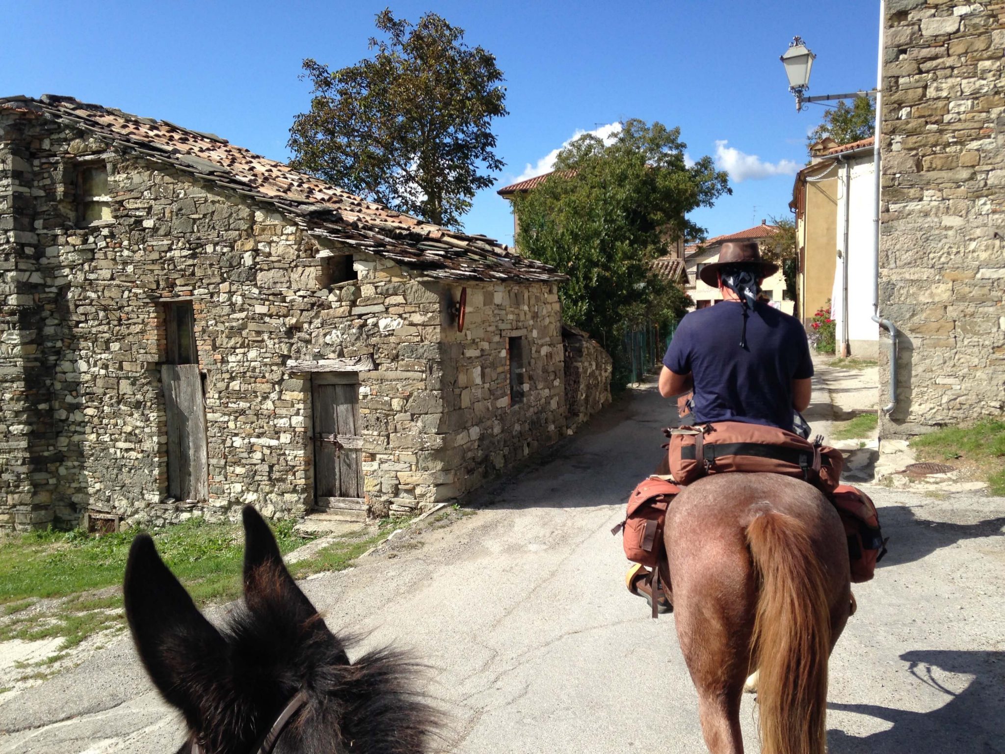 Am nächsten Vormittag heißt es wieder „absteigen“ ins Tal. Zwischendurch steigen wir ab, und schlagen uns gemeinsam mit unseren vierbeinigen Freunden durchs dichte Gebüsch. Zum Glück hat Stefan die gesamte Route noch im Kopf bzw. gekennzeichnet, denn hier begegnen wir nur selten Menschen. Das soll sich aber bald ändern, denn nach ein paar Stunden lichtet sich der Wald … und wir sind wieder in der „Zivilisation“ angekommen – genauer: in Sansepolcro, wo wir diese Nacht verbringen. Pferde zuerst versorgen ist immer das oberste Gebot. Dann kommt aber auch wieder unsere kulinarische „Versorgung“ im wunderschönen Landhaus Antico Borgo De Romolini in Sansepolcro nicht zu kurz.
