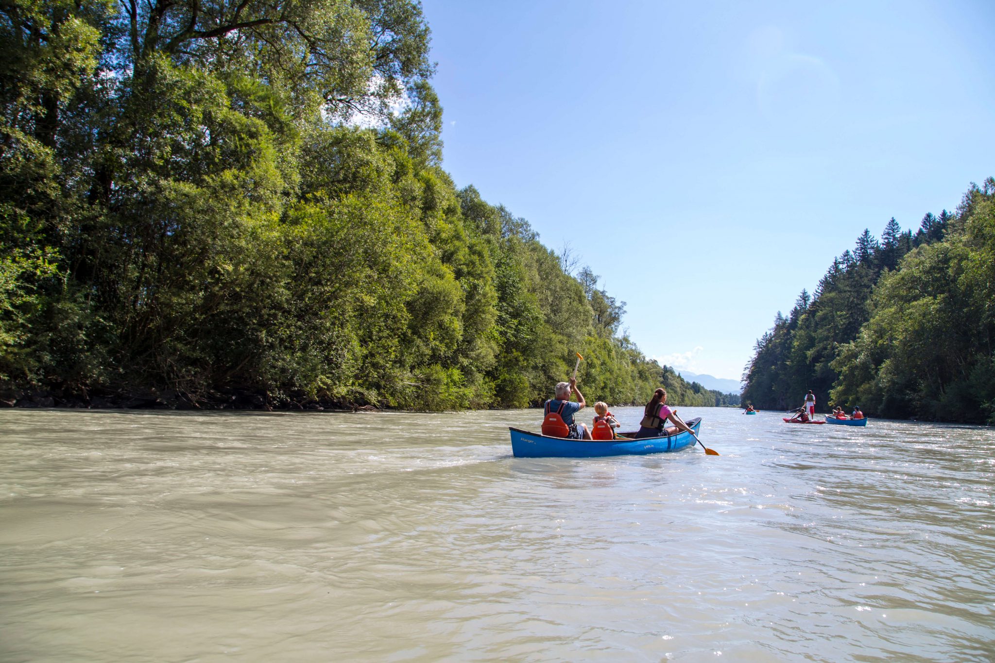 Paddeln auf der Drau ist kinderleicht. Nach ein paar Instruktionen an Land wird der blitzblaue Kanadier von der Sandbank ins Wasser geschoben und schon geht es flussabwärts. Eine halbe Stunde später fällt das Steuern ganz leicht und man kann das naturbelassene Ufer sowie ein herrliches Bergpanorama genießen. 30 Flusskilometer ziehen wie im Flug vorbei.