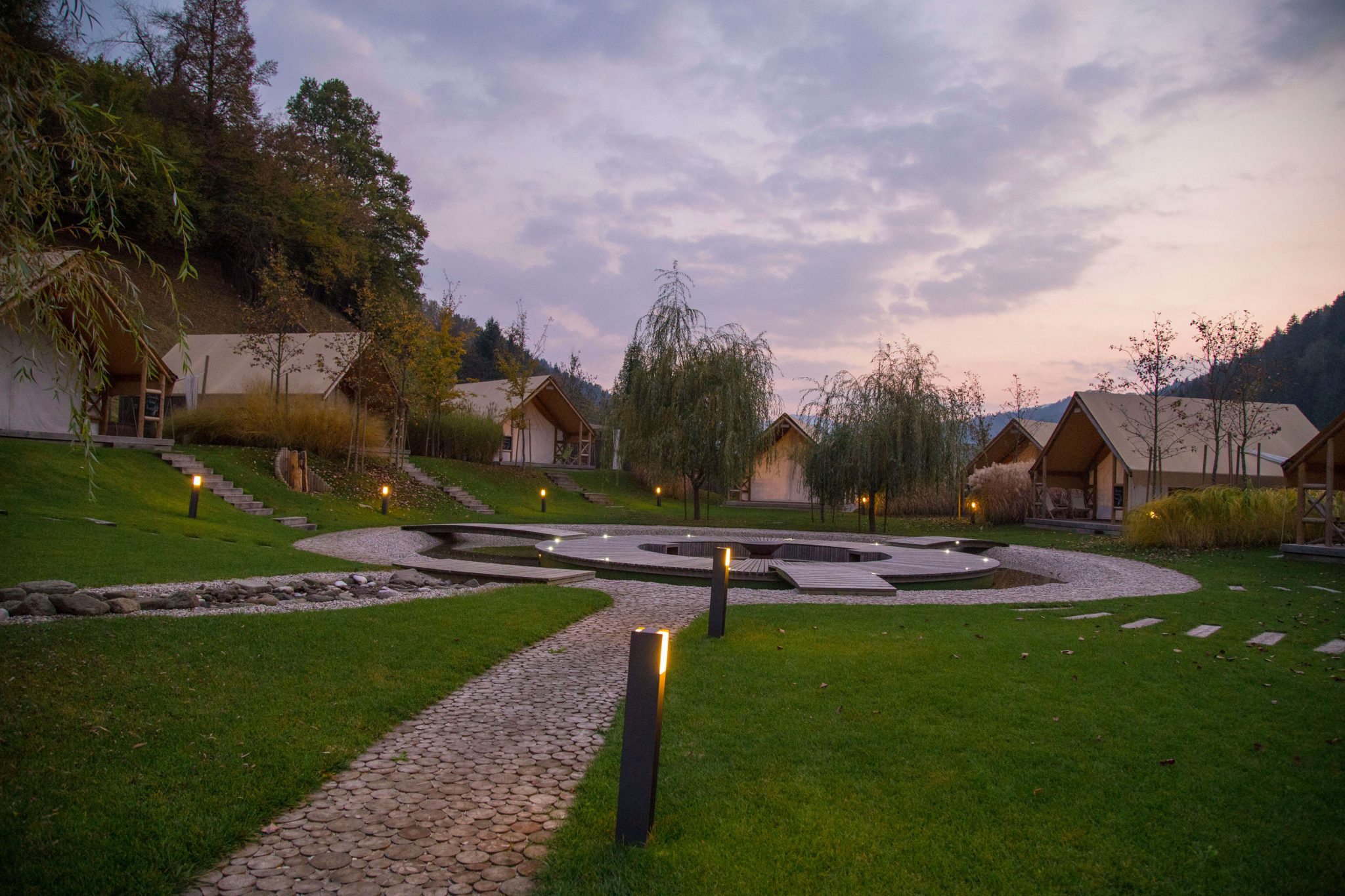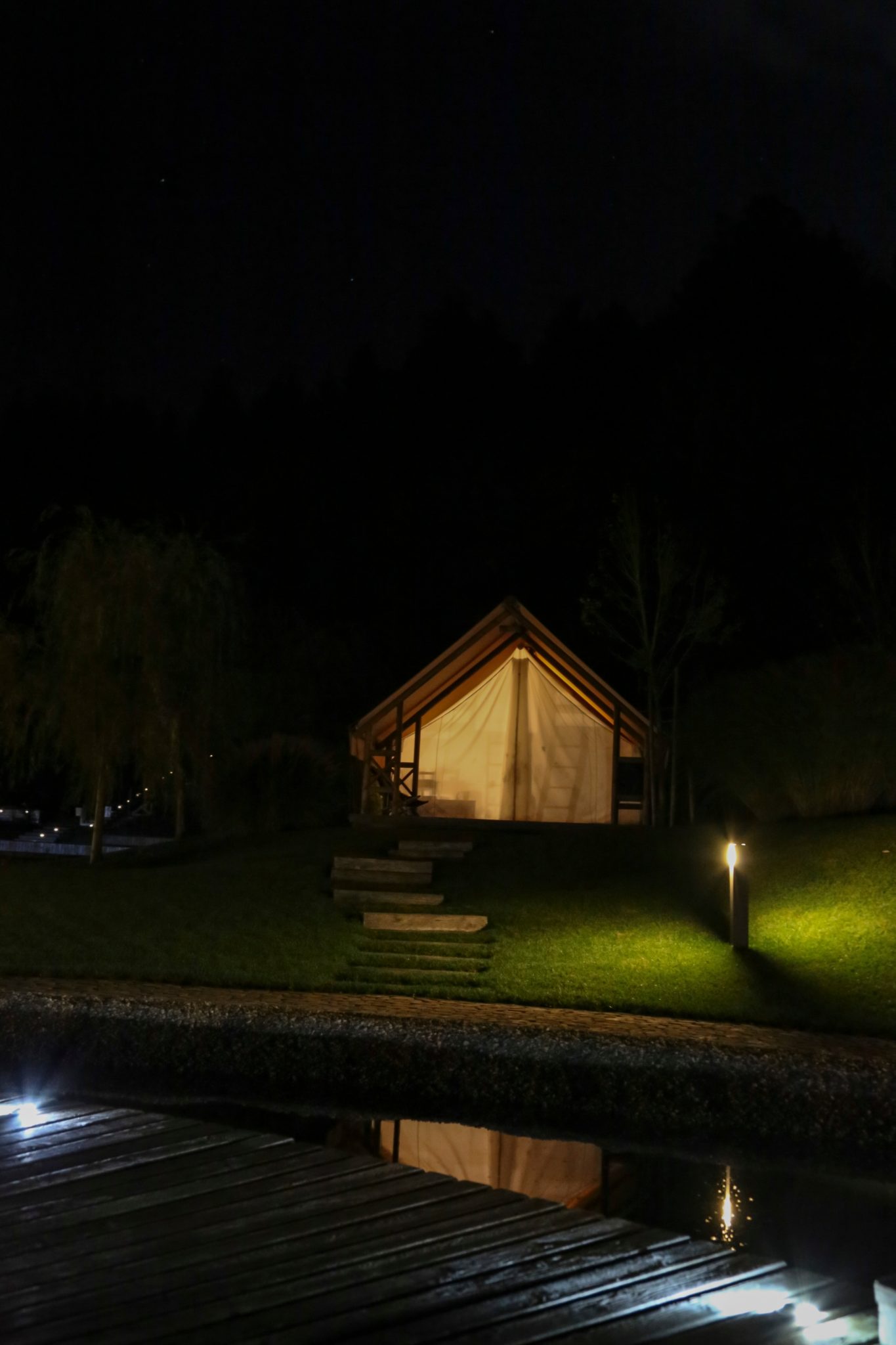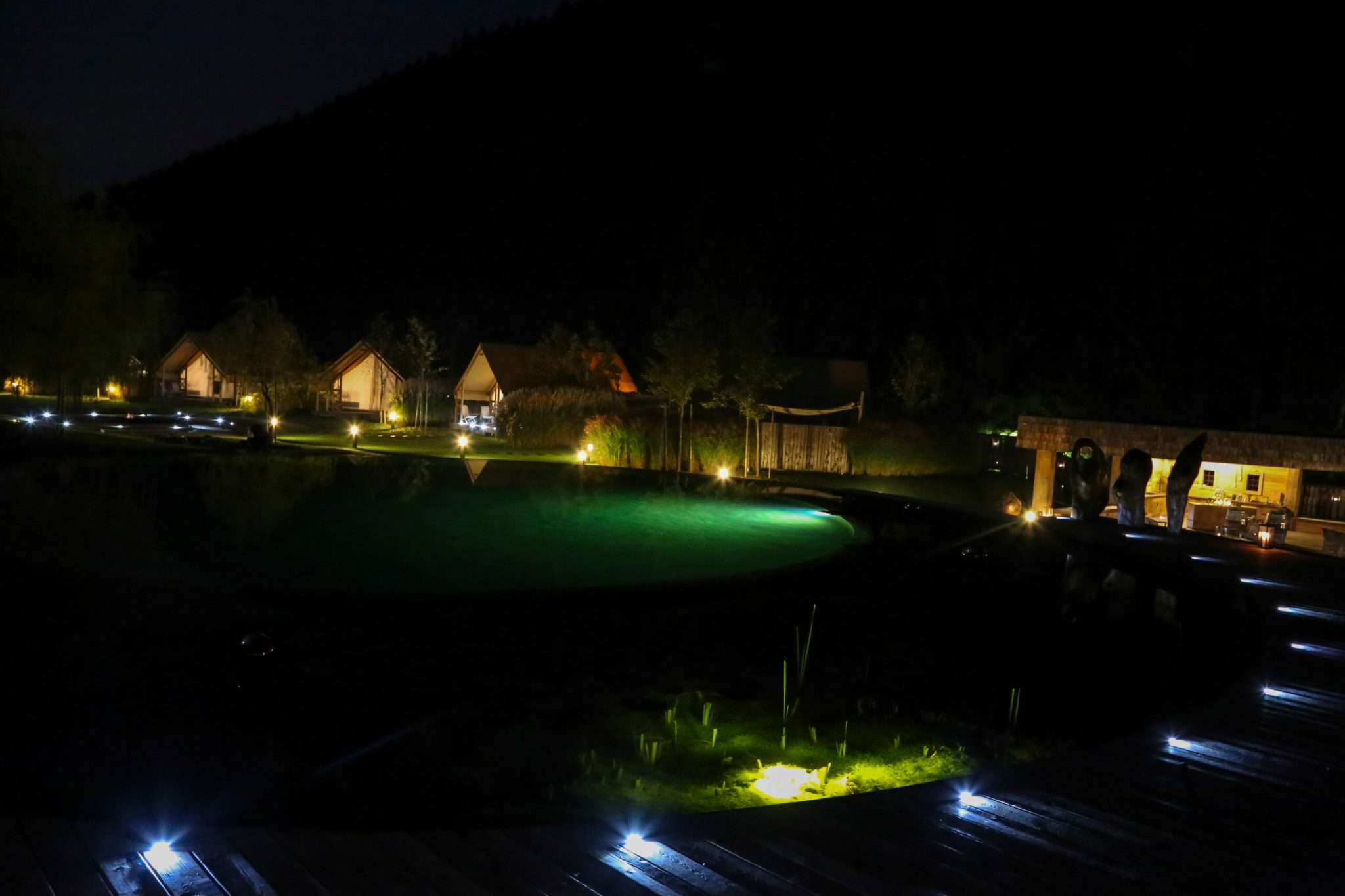 Das Resort selbst wirkt durch die Holzstege, den großen Schwimmteich und die Beleuchtung sehr edel. Die Glamping-Zelte sind kreisförmig um den Lagerfeuerplatz angeordnet. Jedes hat einen eigenen Whirlpool, Heizung, Bad, WC und eine mit Glas überdachte Outdoordusche, die direkt vom Badezimmer aus zu erreichen ist.