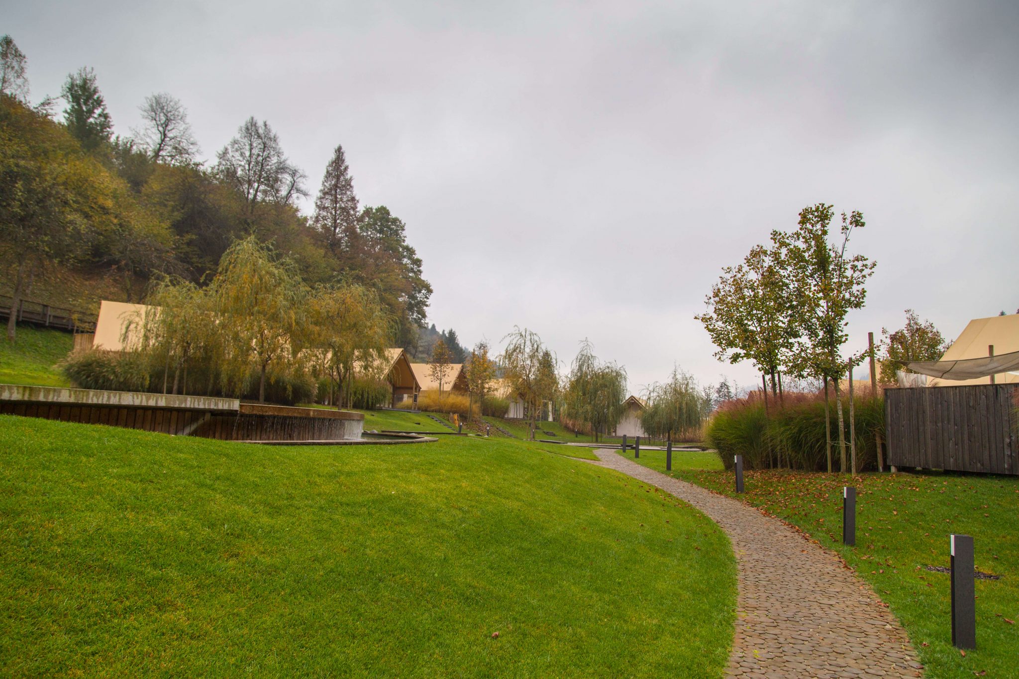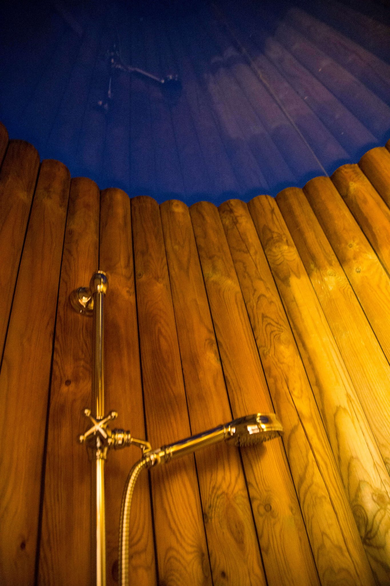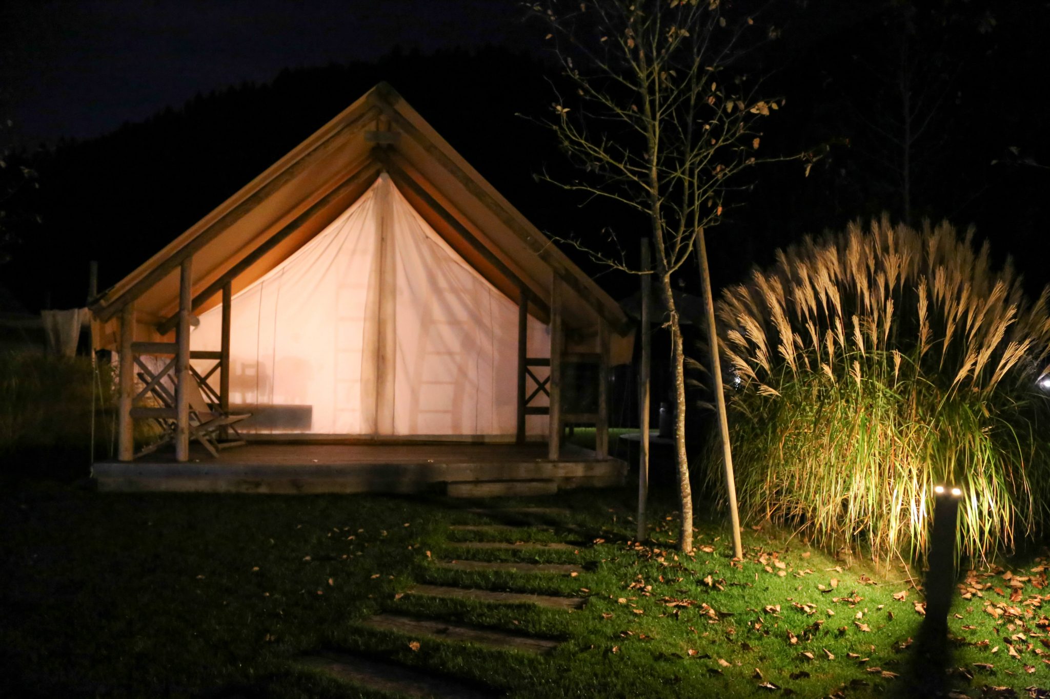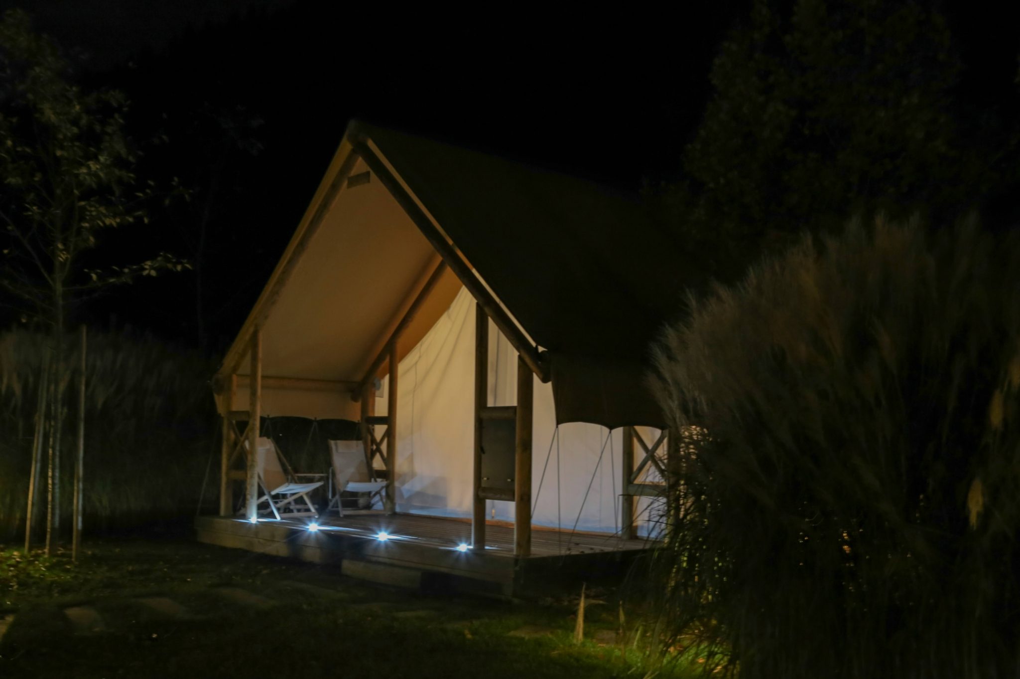 Das Resort selbst wirkt durch die Holzstege, den großen Schwimmteich und die Beleuchtung sehr edel. Die Glamping-Zelte sind kreisförmig um den Lagerfeuerplatz angeordnet. Jedes hat einen eigenen Whirlpool, Heizung, Bad, WC und eine mit Glas überdachte Outdoordusche, die direkt vom Badezimmer aus zu erreichen ist.